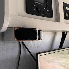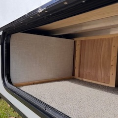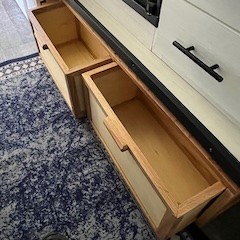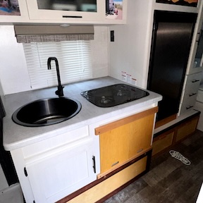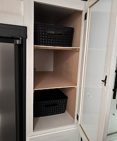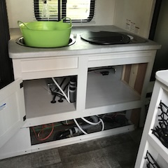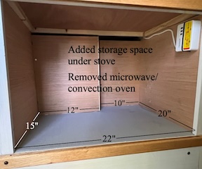 | The space under the stove was converted into 2.6 cubic feet of storage with 110 AC and USB outlets. | ![]() |