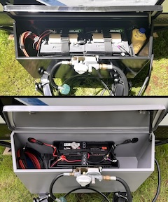 Power Storage of Millie's electrical power has evolved from a single 12V marine/rv battery, provided by the dealer, to two 6V golf cart batteries, wired in series, to a single 12V 140Ah LiFePO4 battery. The original battery was limited in terms of capacity (80Ah). At 220Ah, the 2 golf cart batteries had sufficient capacity for our needs, but were remarkably heavy (120 lbs). Also, these conventional lead-acid batteries could only be drawn down to about 50% without risking damage, limiting their effective capacity. The lithium battery is rather ideal. It only weighs 28 lbs; it can be completely depleted without damage, such that all 140 amp-hours can be used; it's protected by a built-in battery management system (BMS); and a Bluetooth app monitors its state of charge, rates of discharge and recharge, balancing of cells, and status of the BMS. With our conservative habits, we only use 10 to 20 amp-hours per day and can easily go a week without recharge. We also have no need for AC electricity when we're off grid. Hence, we have no generator and no inverter. Although Millie's lithium battery will recharge to 90% or more by her original WFCO converter and by the tow vehicle's 200A alternator, we prefer to use our 100W solar suitcase, with its controller set for lithium. We also have a 20A lithium battery charger for when we have shore power. A complete charge, by either of these means, causes the BMS to balance the cells. image: two 6V golf cart batteries (top) were replaced by a single 12V LiFePO4 battery (bottom), housed in the tongue box we added |