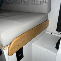Millie's weight. Screws fastening the original, rather flimsy, dinette cushion retainers pulled out after our first use of the dinette. Replacements are made of solid oak and are fastened with more substantial screws (right). |