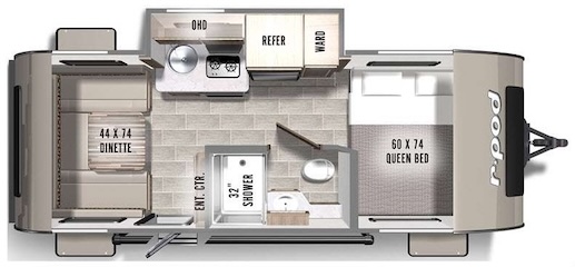 Plan Millie's floor plan includes a queen-size bed (RV short queen), a dry bathroom with a small shower, a modest kitchen area, and a dinette with seating for 2 to 4 people that converts into an additional bed. The kitchen includes a sink, a stove (propane), and a refrigerator (propane/110 AC). It originally included a microwave/convection oven that we removed. This floor plan suits us, a retired married couple, very well, although the bed is difficult to make and one of us has to crawl over the other. |
