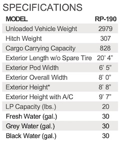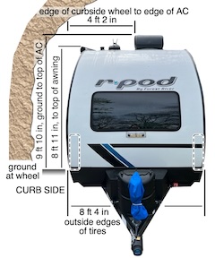 and Dimensions As she left the factory, Millie weighed in at 3,188 lbs (1,446 kg), substantially more than what is indicated on the spec sheet. Compared to her GVWR of 3,800 lbs, Millie's modified dry weight of 3,258 lbs leaves only 542 lbs for cargo. The modifications that added 70 lbs to her dry weight are described below. Fully loaded for an extended trip, but with empty water tanks, Millie weighs in at 3,780 lbs (weight from CAT scales). By actual measurement, Millie is 21' 11" in length, from the back of her spare tire (rear factory mount) to the forward edge of her coupler. Without the spare, she's 20' 10" long. To the top of her roof-mounted 15K air conditioner, Millie is 9' 10" tall. She's 8' 4" wide, between the outside edges of her tires (Goodyear Endurance ST225/75R15), though the shell of the trailer is only 6' 5" wide. |