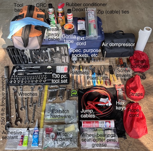 | Tools In interest of being prepared, we carry a fairly extensive (and heavy, 60 lbs) tool set, much of which is shown in the image (right). Special purpose sockets include 1 7/8" (2" ball), 1 1/8" (E2 hitch), 1 1/16" (anode rod), 3/4" hex (lug nuts and E2 hitch), and 21mm hex (TV lug nuts). Special purpose wrenches include 1 1/16" (E2 hitch) and 19mm (E2 hitch). Other tools and supplies, stored elsewhere (not shown), include multimeters, fuses, wire, crimp connectors, electrical tape, 20A lithium battery charger, 30A plug adaptors (dogbones), 100W solar suitcase, 8mm socket on 1/4" driver handle (AC bolts), square driver (common RPod screws), claw hammer, short-handled shovel, 4-foot step ladder, 1500A jump starter battery, scissor jack and accessories from TV (F150), and tools for stabilizer jacks, E2 bars, the tongue jack, and the awning. Many of these tools have come in handy on several occasions. |