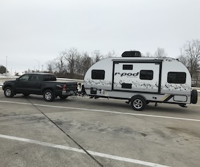 Millie Millie is a 2021 R•Pod, RP190. We bought her new and towed her home to the Chattanooga area, from Trenton, Ohio, in late January of 2021. The concept of the "millipod" was inspired by our grandson's passion for millipedes and their vague resemblance to an R•Pod. That evolved into the name "Millie", as in "Millie" the millipod. On our way home from picking up Millie, we stopped at a rest area south of Cincinnati (right). This is our first photo of Millie. |